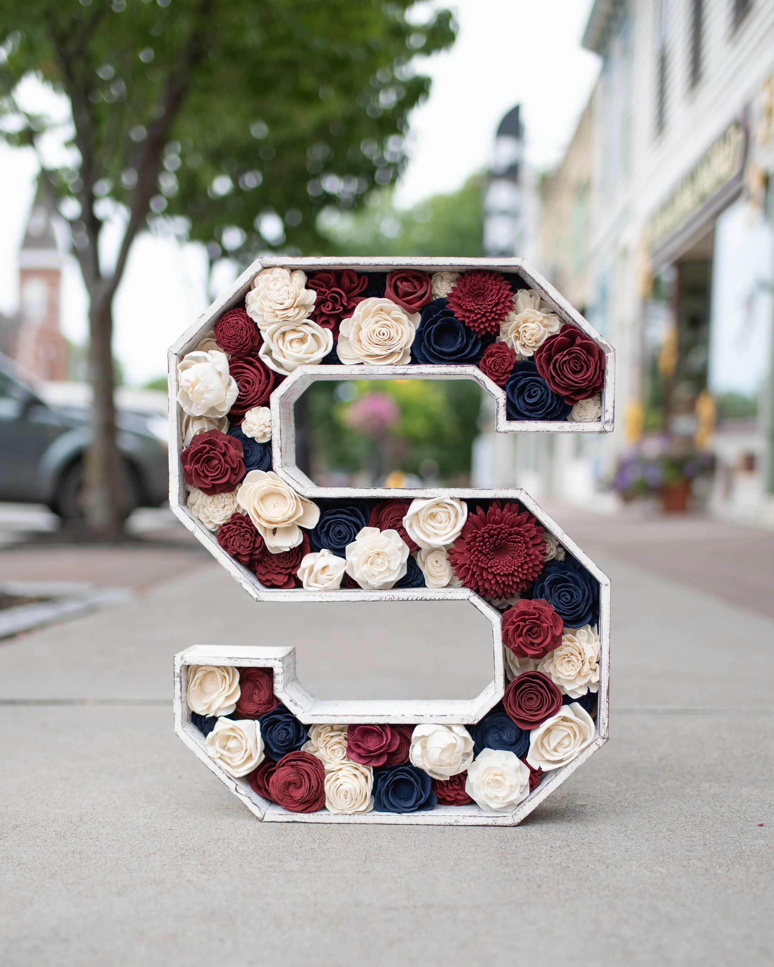 Our flower filled letters can be custom made to any letter in the alphabet, with any stain color you prefer and any flower color you can imagine!